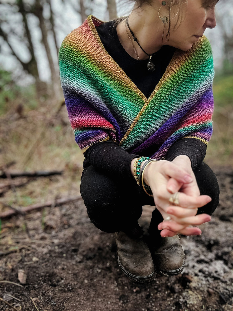 Knitted works begin their life from a cloud of raw fleece and range from pocket-size amulet pouches to wrist warmers and large shawls. Theresa especially enjoys working with Scottish rare breeds such as Shetland and North Ronaldsay sheep. However, when the fleece is sourced directly from the landscape the wool is often naturally scoured by inclement weather and is more challenging to work with. A quick carding using a drop spindle makes it easier to spin. Theresa also uses a Danish technique known as dogmestrik (dogma knitting), which entails pulling yarn directly from the raw fleece and knitting with it unprocessed and unspun. The fibre is strong, durable and easy to knit with because of the coarse overcoat while also soft and pliable due to the fluffy undercoat. Once the garment or work is finished, it is washed and shaped before drying naturally.