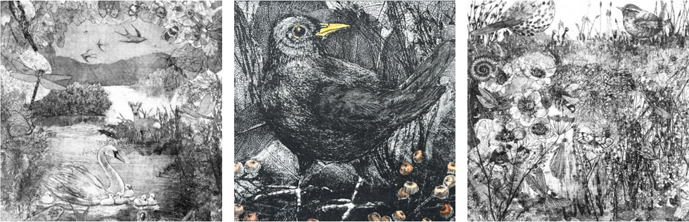 Working from her Comrie based garden studio, Sheila’s designs are made through soft etchings using layers of techniques working with metal, acid, wax, paper and finally ink.